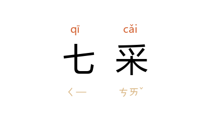 引《西京杂记》卷一:“高祖 斩白蛇剑,剑上有七采珠、九华玉以为饰。”南朝 梁 江淹 《丹砂可学赋》:“烂七采之炤燿,漫五色之煴烟。”《花城》1981年第6期:“这些年来,我那七彩虹霓般的梦,早就幻灭了。”