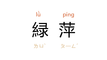 ⒈ 亦作“绿苹”。绿色的浮萍。