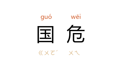 引《周礼·秋官·小司寇》:“一曰询国危,二曰询国迁。”郑玄 注:“国危谓有兵寇之难。”《左传·桓公五年》:“度其国危,遂不復。”《韩非子·三守》:“人主有三守。三守完,则国安身荣;三守不完,则国危身殆。”