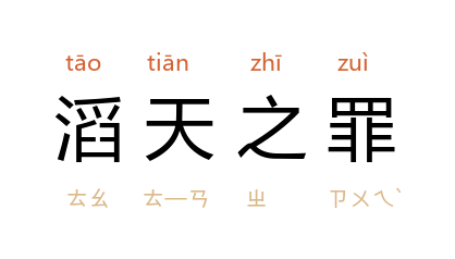 引宋·苏轼〈吕惠卿责授建宁军节度副使本州安置不得签书公事〉:「稍正滔天之罪,永为垂世之规。」明·罗贯中《风云会·第四折》:「据著你外作禽荒,内贪淫欲,滔天之罪,理合法更凌迟。」