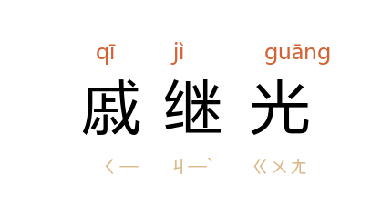 ⒈ (1528-1587)明朝抗倭名将、军事家。字元敬,山东登州(今蓬莱)人。将门出身。嘉靖后期,被调至浙东防倭。他招募义乌农民矿工,训练出一支纪律严明、战斗力强的军队,人称“戚家军”。在台州(今浙江临海)一带九战九捷,全歼倭寇。后又入福建、广东与抗倭名将俞大猷配合,消灭盘踞在福建的倭寇主力,解除东南沿海倭患。1567年奉调至蓟州,在镇十六年,修筑长城,加强战备。著有《纪效新书》等。