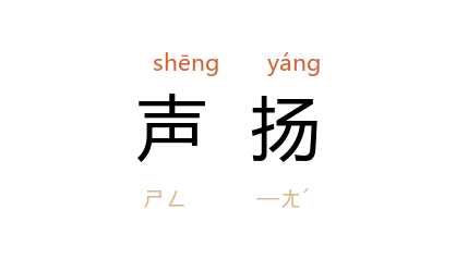 引元 白朴 《墙头马上》第二折:“他每去也,若夫人问时,説个谎道:‘不知怎生走了。’料夫人必然不敢声扬。”《三国演义》第四一回:“﹝ 刘玄德 ﹞令 孙乾、简雍 在城中声扬曰:‘今 曹 兵将至,孤城不可久守。’”清 褚人穫 《坚瓠馀集·异侠借银》:“幸勿声扬,否将不利於君。”