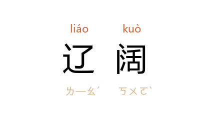 ⒈ 辽远、广阔。唐·李商隐〈东下三旬苦于风土马上戏作〉诗:「天地辽阔谁相待,日日虚乘九万风。」也作「辽廓」。
