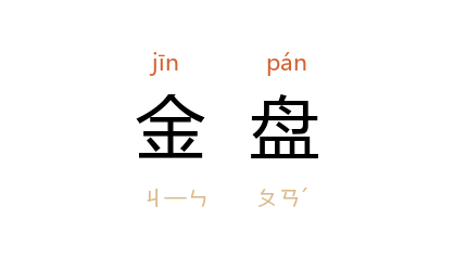 ⒉ 金属制成的盘。(1)餐具。汉辛延年《羽林郎》诗:“就我求珍肴,金盘脍鲤鱼。”《南史·刘穆之传》:“及至醉饱,令厨人以金柈贮槟榔一斛以进之。”王闿运《采芬女子墓志铭》:“金盘罢进,讵擘麻姑之脯。”(2)烛盘。唐岑参《陪群公龙冈寺泛舟》诗:“紫鳞掣芳饵,红烛燃金盘。”(3)承露之盘。《后汉书·陶谦传》:“大起浮屠寺,上累金盘,下为重楼。”北魏杨衒之《洛阳伽蓝记·永宁寺》:“刹上有金宝瓶,容二十五石。寶瓶下有承露金盘三十重。”唐韩偓《中秋禁直》诗:“露和玉屑金盘冷,月射珠光贝阙寒。”(4)古代博具之一。唐李白《送外甥郑灌从军》诗之一:“六博争雄好彩来,金盘一掷万人开。”
