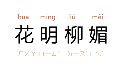 引《儒林外史》第一回:“遇着花明柳媚的时节,把一乘牛车载了母亲,他便戴了高帽……在乡村镇上以及湖边,到处顽耍。”清 徐大椿 《洄溪道情·题唐悔生寒林行啸图》:“待得花明柳媚,看雕鞍骏马,又去踏春风。”
