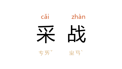 引明 单本 《蕉帕记·幻形》:“连宵拜斗魄犹沉,经年鍊气丹难就;待借些採战,向何处搜求。”参见“採补”。掷骰赌彩。 宋 高承 《事物纪原·农业陶渔·投子》:“明皇 与 杨妃 采战,将北,唯重四可战败为胜,上掷而连呼叱之,宛转良久,而成重四,上大悦。”