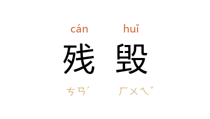引《后汉书·袁绍传》:“今朝廷播越,宗庙残毁。”宋 周密 《癸辛杂识后集·游阅古泉》:“虽草木残毁殆尽,而巖石秀润可爱。”清 顾炎武 《孝陵图》诗:“陵卫多官军,残毁法不捕。”