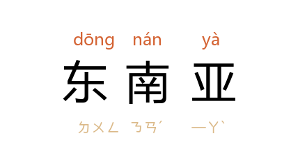 ⒈ 亚洲 的东南部。包括 越南、柬埔寨、老挝、泰国、缅甸、马来西亚、新加坡、菲律宾、印度尼西亚、东帝汶 和 文莱 等国。