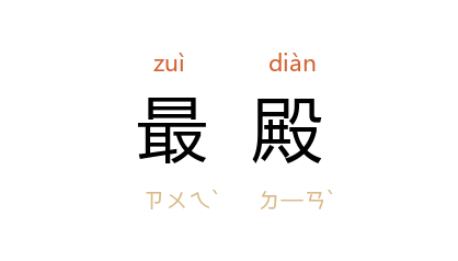 ⒈ 在最后面;最落后。考绩纪功的优劣,上功曰最,下功曰殿。