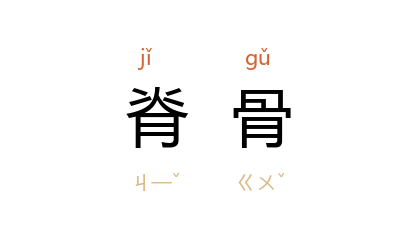 引《北史·西域传·漕国》:“祠前有一鱼脊骨,有孔,中通马骑出入。”宋 黄庭坚 《题竹尊者轩》诗:“平生脊骨硬如铁,听风听雨随宜説。”《医宗金鉴·正骨心法要旨·背骨》:“背者,自后身大椎骨以下,腰以上之通称也。其骨一名脊骨,一名膂骨,俗呼脊梁骨。”