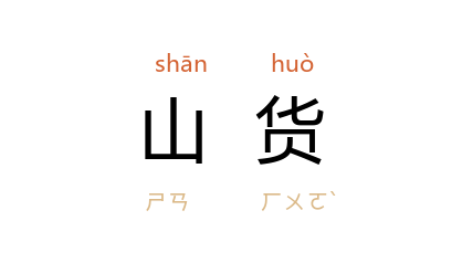 ⒈ 产于山里的动植物的总称。或称以其为材料所制造的手工艺品。