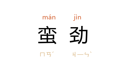 引老舍 《四世同堂》十六:“今天,他没有吃酒,也就没有伸出拳头去的蛮劲儿。”曹禺 《雷雨》第一幕:“她的性格中有一股不可抑制的‘蛮劲’,使她能够忽然做出不顾一切的决定。”茅盾 《多角关系》六:“二老板 苦笑了一下,知道这位洋货店老板,有几分蛮劲。”