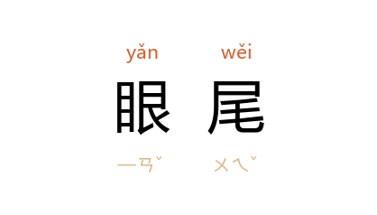 引唐 李贺 《谢秀才有妾缟练改从于人》诗之二:“腮花弄暗粉,眼尾泪侵寒。”宋 梅尧臣 《和宋中道元夕》之一:“摩肩一过难久存,眼尾获笑迷精魂。”欧阳山 《柳暗花明》八二:“她的脸蛋红得像一团火一样,向上弯起的眼尾,一直插进鬓边儿。”