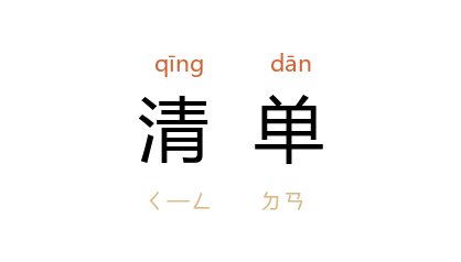 引《清史稿·时宪志一》:“现届本年八月十五日月食,谨将新拟用数推算得时刻食分方位,比较原推早见分秒,另缮清单进呈。”《二十年目睹之怪现状》第七回:“将两年多的往来帐目,抄了一张清单。”曹禺 《日出》第四幕:“这是你的薪水清单。”