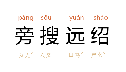 引唐 韩愈 《进学解》:“寻坠绪之茫茫,独旁搜而远绍。”清 魏源 《书古微》序:“坠绪茫茫,旁搜远绍,其得於经者凡四大端。”亦作“旁蒐远绍”。 王国维 《<玉谿生年谱>序》:“君独旁蒐远绍,博采 唐 人文集、説部及金石文字,以正 刘 宋 二书之失。”