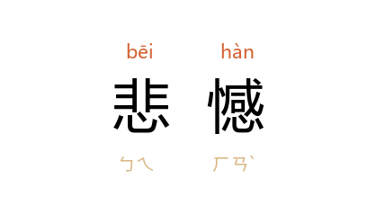 引南朝 梁 江淹 《横吹赋》:“西骨 秦 气,悲憾如懟;北质 燕 声,酸极无已。”《诗刊》1978年第3期:“耳闻哀音却又不相信,心中不敢想却又泪落成行……是极度悲憾而又极其思念所产生的矛盾心理。”