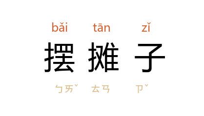 ⒈ 小贩在街上或市场中摆设摊位,陈列货品叫卖。也作「摆地摊」、「摆摊儿」。