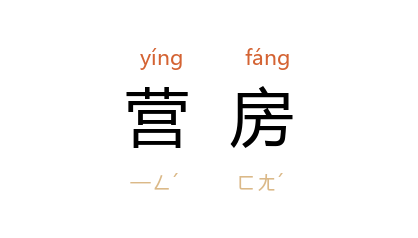 引宋 苏轼 《乞降度牒修定州禁军营房状》:“据逐官回申,营房大段损坏,不庇风雨。”明 沉德符 《野获编·畿辅·四辅城》:“每城置兵万人,内设营房,外设教场。”老舍 《四世同堂》十三:“硬说 日本 兵要用 瑞全 的学校作营房,所以学生都搬到学校里去住,好教 日本 兵去另找地方。”