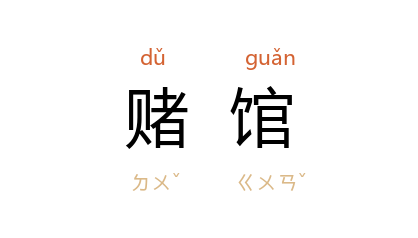 引《二十年目睹之怪现状》第五九回:“他却在工场旁边,设了许多妓馆、赌馆、烟馆之类,无非是销耗钱财的所在。”苏曼殊 《绛纱记》:“天明,余醒,思此事甚奇,此金必为神所賚,即趋至赌馆,一博去其半,再博而尽。”