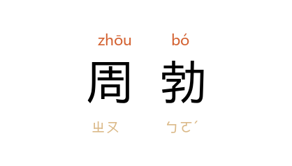 ⒈ 汉初大臣。沛县(今属江苏)人。秦末从刘邦起义,以军功为将军,封绛侯。吕后时,任太尉。吕后死,他与陈平定计,入北军号召将士拥护刘氏,诛杀企图发动叛乱的诸吕,迎立文帝,任右丞相。