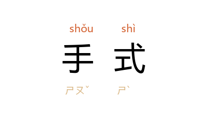 引《文明小史》第四五回:“照你这样説来, 北京 俄罗斯 公使有什么事找到外务部,难道做手式么?”景梅九 《罪案》:“古人説‘机事不密则害成’,一点不差。所以同盟会有种种约定的祕语和手式等,以为表示同志的作用。”梁斌 《播火记》四四:“大贵 提着盒子枪,打个手式,叫 湘农 闪在路旁庄稼地里。”