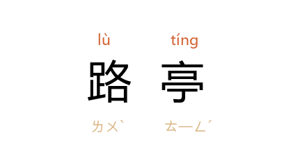 引徐蔚南 《山阴道上》:“道上有个路亭,我们每次走到路亭里,必定坐下来休息一会。”许杰 《惨雾》:“在那个荫着一株老树的路亭里面,他说她到 玉湖 后,过了几日就来看她。”