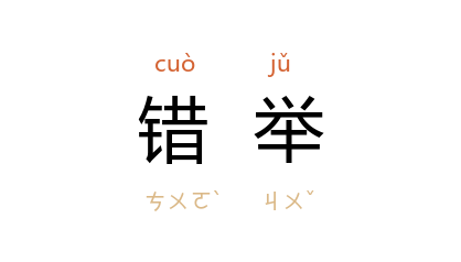 引晋 杜预 《<春秋经传集解>序》:“故史之所记,必表年以首事,年有四时,故错举以为所记之名也。”杨树达 《古书疑义举例续补·两名错举例》:“《汉书》他篇中两名错举之例尚多。 《邹阳传》云:‘六齐望于 惠后。’ 孟康 注:‘谓 惠帝 与 吕后。’”