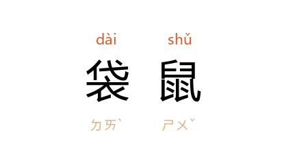 ⒈ 哺乳动物的一科,形似鼠而体大。前肢短小,后肢粗大,善于跳跃,尾巴粗大,能支持身体。雌的腹部有一育儿袋。种类多。如大袋鼠、树袋鼠等。分布于 澳洲 各地。