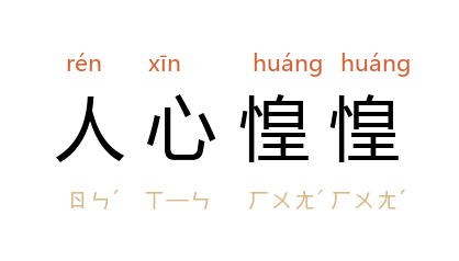 引清 孔尚任 《桃花扇·阻奸》:“但一月无君,人心皇皇,每日议立议迎,全无成説。”吴玉章 《从甲午战争前后到辛亥革命前后的回忆》十七:“一时人心惶惶,谣言四起。”