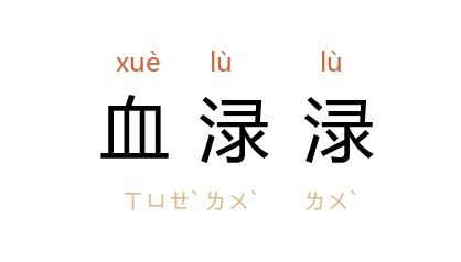 引元 无名氏 《马陵道》第二折:“我饮过这香喷喷三盏儿安魂酒,则被你闪杀我也血渌渌一双脚指头。”元 无名氏 《盆儿鬼》第二折:“我则道是血碌碌尸首堆垜,怎将他磣磕磕把盆儿揑做。”《水浒传》第二六回:“武松 把那被包打开一抖,那颗人头,血渌渌的滚出来。”