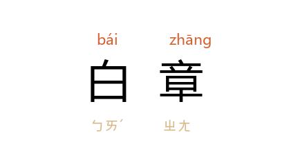 引唐 柳宗元 《捕蛇者说》:“永州 之野产异蛇,黑质而白章。”宋 苏轼 《代书答梁先》诗:“遗我駮石盆与甌,黑质白章声琳球。”明 徐渭 《十白赋·鹦鹉》:“黄冠白章,其鸣嘒嘒。”