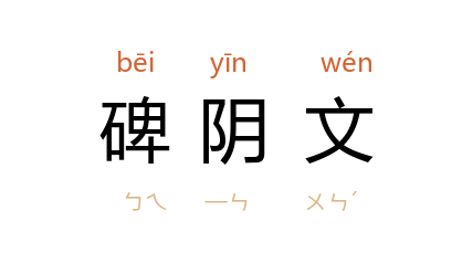 ⒈ 写或刻在碑背面的文字。汉代碑阴文大多数是门生、故吏、撰书人以及石工的题名。唐代开始,才在碑背面作题记等文字。参阅明徐师曾《文体明辨序说·碑阴文》。