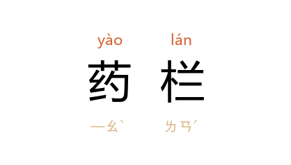 ⒈ 芍药之栏。泛指花栏。南朝梁庾肩吾《和竹斋》:“向岭分花径,随阶转药栏。”唐杜甫《宾至》诗:“不嫌野外无供给,乘兴还来看药栏。”明王錂《春芜记·感叹》:“出香闺数重,药栏花拥,盈盈莲步香尘动。”《儒林外史》第八回:“先人敝庐可蔽风雨;就是琴、樽、垆、几,药栏,花榭,都也还有几处,可以消遣。”一说,药、栏同义,指一物。