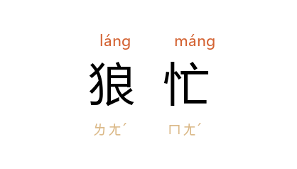 引唐 李中 《离家》诗:“月生江上乡心动,投宿狼忙近酒家。”五代 王定保 《唐摭言·通榜》:“夜艾, 寿儿 以一蜡弹丸进 顥,即榜也。 顥 得之大喜,狼忙札之,一无更易。”秦牧 《艺海拾贝·“狼吞虎咽”》:“和狼有关的形容词语,还有‘狼籍’、‘狼忙’、‘狼狠’等等。”