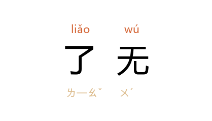 引晋 葛洪 《抱朴子·释滞》:“空有疲困之劳,了无錙銖之益也。”唐 李白 《赠黄山胡公求白鹇》诗序:“自小驯狎,了无惊猜。”清 袁枚 《新齐谐·山阴风灾》:“二十四日晨起,天气清和,了无变态。”