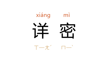 引《后汉书·左雄等传论》:“郎顗 阴阳详密, 张衡 机术特妙。”宋 王安石 《集贤殿修撰萧君墓志铭》:“盖其言详密,多世务之要。”郭沫若 《恢复·巫峡的回忆》:“有个机会时我很想再去详密的探访。”