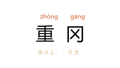 引宋 梅尧臣 《送阎中孚郎中知磁州》诗:“重冈古猎场,惊兔离衰草。”明 徐弘祖 《徐霞客游记·粤西游日记二》:“独秀、莲蕊 二峯,为此峯门户,其内环壑深堑,亏蔽日月,重冈间之,人无至者。”清 厉鹗 《自栖霞至金陵道中得四绝句》之三:“蹔憩吟鞍拜 蒋王,云旗髣髴护重冈。”