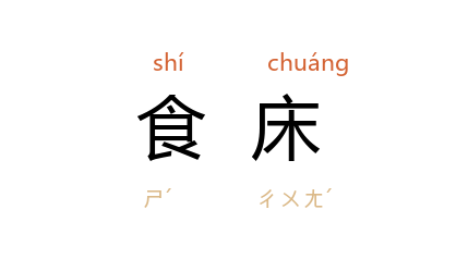 引前蜀 杜光庭 《录异记·异龟》:“唐 有贾客维舟 汴河 上,获一巨龟。於灶火上煨之。是夕,偶忘出之。明日取视,皮壳已燋矣。拂拭去灰,置於食牀上,欲以助餐。”宋 洪迈 《夷坚丙志·鳖逐人》:“相逐愈急,窘甚,跳登食牀,鳖竞缘四脚而上。”