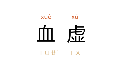 ⒈ 中医上指因血液不足而造成虚弱的病症。多因失血过多,脏腑虚损等原因造成贫血。可分为心血虚、肝血虚等类型。
