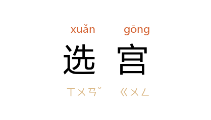 明 周履靖 《锦笺记·代选》:“小姐又值选宫,你看,这几日大家小户,谁不嫁女婚男……我想选宫一説,或出里巷流言,犹之可也;若有朝廷旨意,如之奈何?”