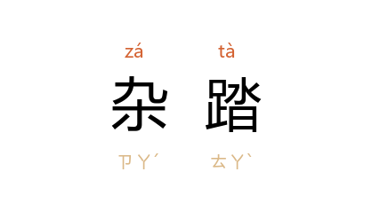 引苏曼殊 《绛纱记》:“余偕 霏玉 出游,过 味莼园,男女杂踏。”巴金 《将军集·五十多个》:“树林里并不是完全静寂的,脚步声,脚在泥泞里杂踏的声音,印在每个人的心上。”