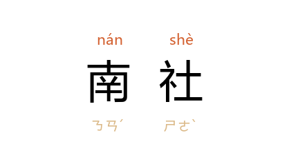 ⒈ 辛亥革命时期的进步文学团体。由陈去病、高旭、柳亚子等发起,于1909年成立于苏州。其社名取“操南音不忘其旧”之意,鼓吹资产阶级民主革命,反对清王朝的专制统治。早期参加者多同盟会成员,其后流品渐杂。社员曾达千余人。1923年因内部分化而停止活动。该社成员所作诗文,辑为《南社丛刻》,共出二十二集。