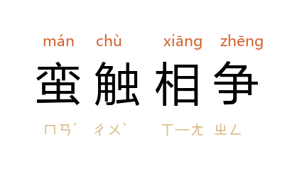 蛮触:蛮氏、触氏,《庄子》寓言中的在蜗牛两角的两个小国。因细小的缘故而引起的争端。