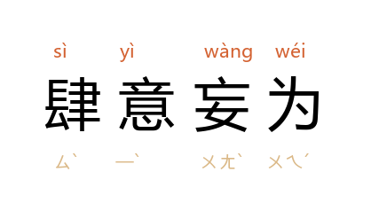 妄:胡乱,非分的,出了常规的。妄为:胡作非为。指不顾一切由着自己的性子胡作非为。亦作“肆意妄行”。