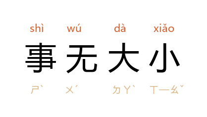 出处《文选 诸葛亮〈出师表〉》:“愚以为宫中之事,事无大小,悉以咨之。”宋 司马光《资治通鉴》卷第一百八十五:“委萧瑀以庶政,事无大小,莫不关掌。”
