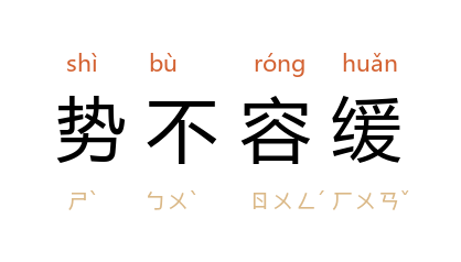势:情势;容:容许;缓:延缓,耽搁。比喻情势紧迫,一刻也不允许拖延。