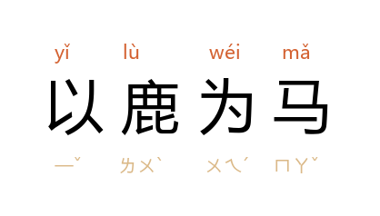 出处汉·陆贾《新语·辨惑》:“秦二世之时,赵高驾鹿而从行,王曰:‘丞相何为驾鹿?’高曰:‘马也。’王曰:‘丞相误邪,以鹿为马也。’高曰:‘乃马也。陛下以臣之言为不然,愿问群臣。’于是乃问群臣,群臣半言马半言鹿。”
