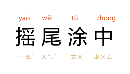 出处战国时,楚王派大夫去请庄子做官,庄子对楚大夫说:听说楚国有神龟,死去已三千年,现在把它用匣子装起来藏在庙堂之上。你看此龟是留下骨头让人珍藏好呢,还是活着曳尾于泥涂中好?大夫说:当然是活着曳尾于涂中好。庄子说:那末我将曳尾于涂中。见