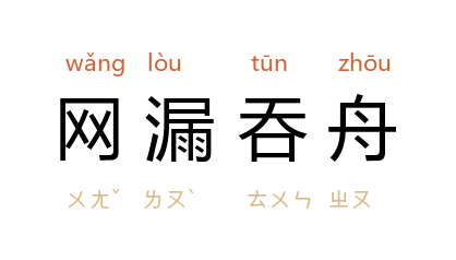 网:渔网,比喻法网;吞舟:吞舟的大鱼,比喻大奸。网里漏掉吞舟大鱼。比喻法律太宽,使重大的罪犯也能漏网。