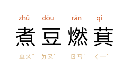 出处南朝 宋 刘义庆《世说新语 文学》:“文帝尝令东阿王七步中作诗,不成者行大法。应声便为诗曰:‘煮豆持作羹,漉菽以为汁,萁在釜下然,豆在釜中泣。本是同根生,相煎何太急。’帝深有惭色